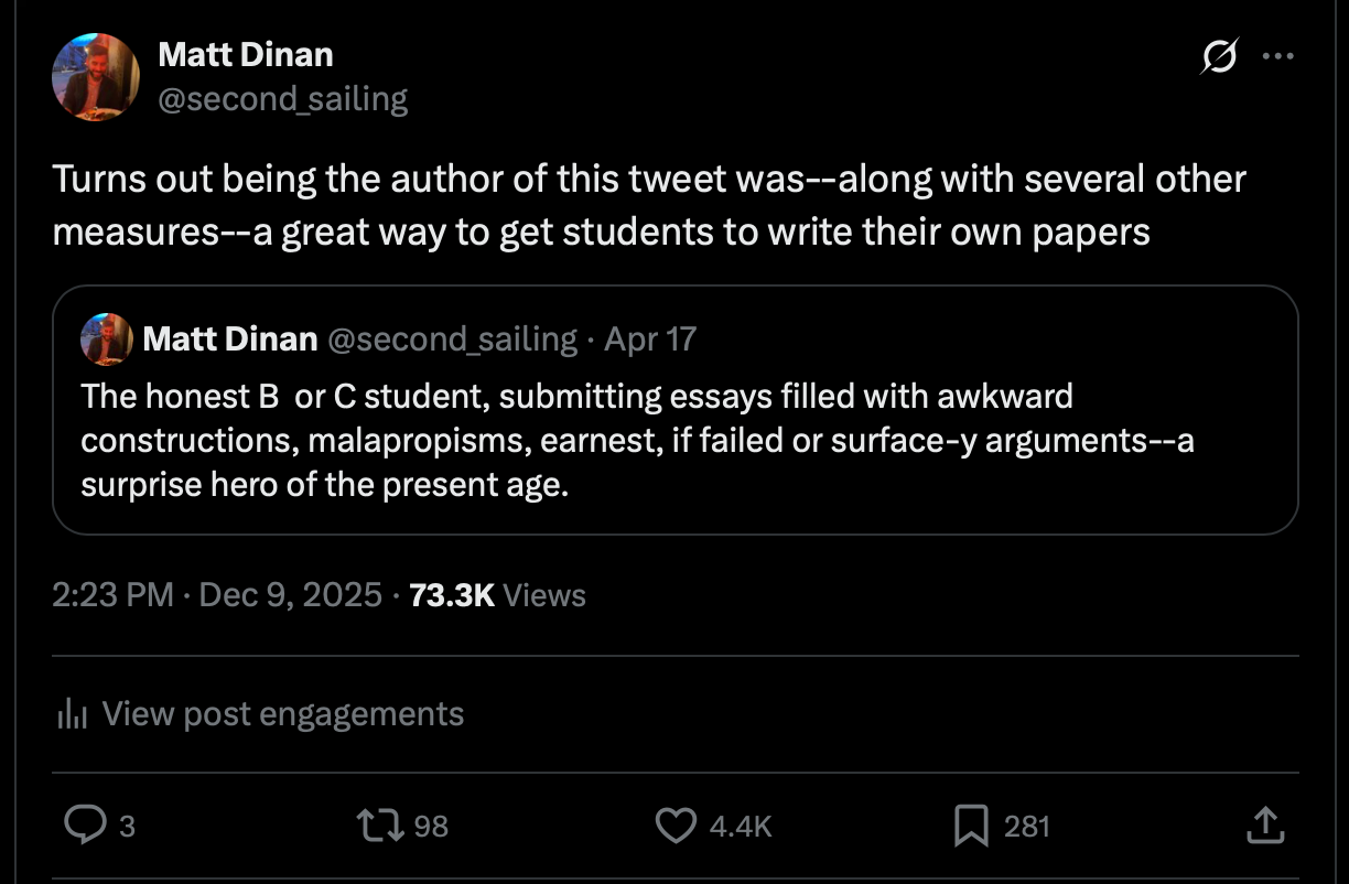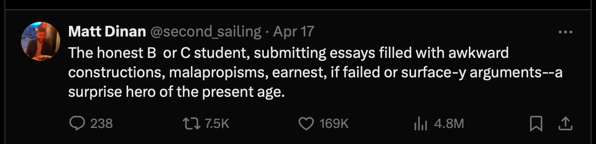 I spent the period between the end of the last academic year and the beginning of the new one (“summer”) fretting about the fate of liberal education in the age of AI. I did some tweeting about it, as one does, and some of those tweets struck a chord. My mother saw a screenshot of my “B or C student” tweet out of context on Facebook and first asked me if I was in fact “second sailing,” then proceeded to ask me: “And what do you get for writing such a viral tweet?” What indeed.